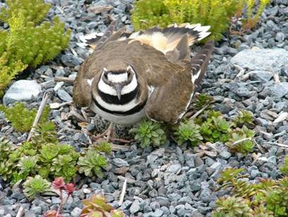Another sometimes underappreciated benefit of green roofs is habitat creation and increased biodiversity. Rooftops can serve as refuge for creatures that struggle for survival, such as ground nesting and migratory birds. One example is the killdeer, they prefer open ground with low vegetation, they run across then stop to see if they startled up any insects for lunch.